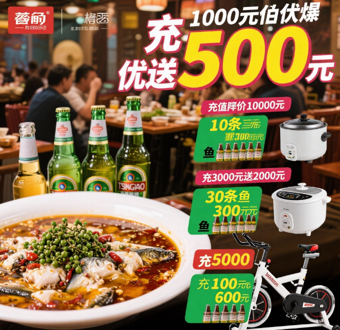 (一)充 1000 元,送 500 元,送 10 条藤椒鱼、100 瓶啤酒。