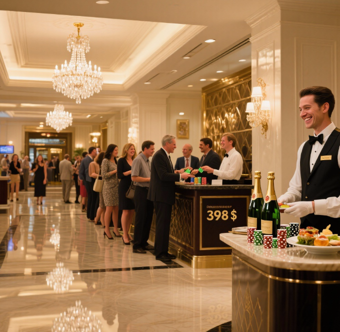 不仅如此,在您入驻我们酒店的时候,再免费送您等值的 398 美元筹码;当然,如果您不想要这个筹码的话,您也可以拿着这个筹码到我们酒店兑金 398 现金”。