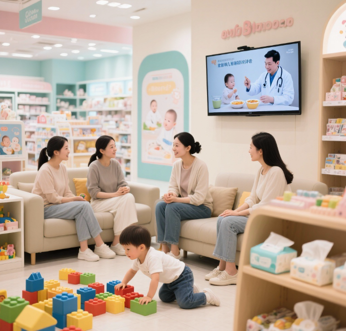 (三)店里面放一个休息区有电视级,循环播放育儿知识和经验,健康知识与常识,安全风险预防,还有关于婴幼儿相关好或者不好新闻的案例,经常播放,让家长免费到店观看学习,旁边有宝宝玩的地方,深度链接文化聚人气。