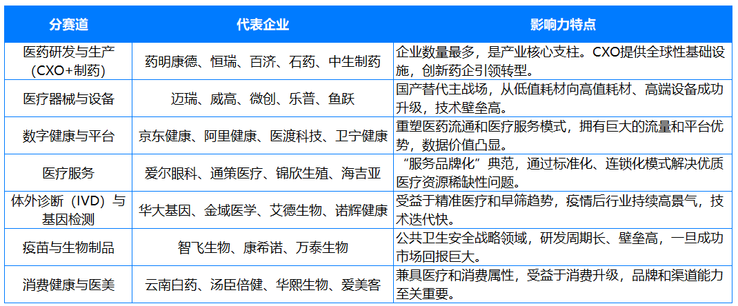 医药电商(京东健康、阿里健康)、医疗服务(爱尔、通策)等,其创新更多体现在商业模式、服务流程和市场规模上。