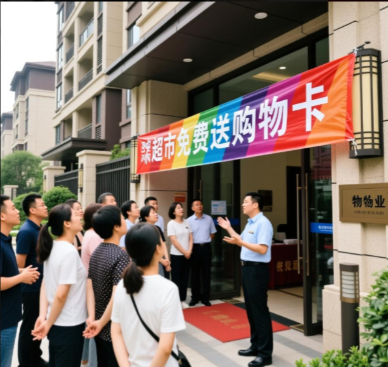 比如,一个住户一年缴纳的物业费是 1000-2000左右 元,然后用户可以获得价值 1000-2000元相等价值的超市购物卡,如果你是物业,你愿不愿意合作?然后物业来负责宣传广告横幅。